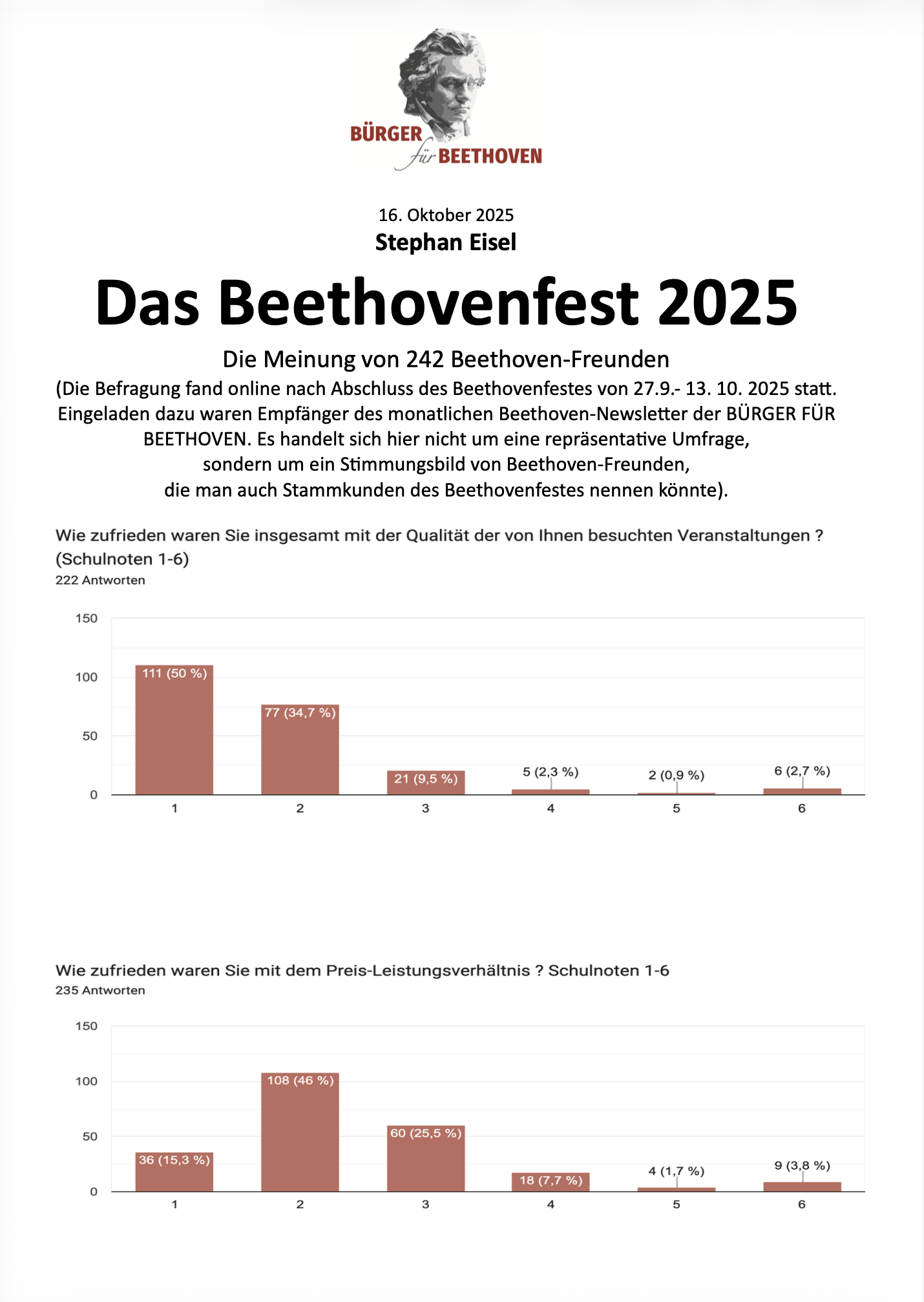 85 Prozent der Beethoven-Freunde, die das Beethovenfest 2025 besucht haben, bewerten die Qualität der von ihnen besuchten Veranstaltungen mit sehr gut (50%) oder gut (34,7%), nur fünf Prozent waren unzufrieden. Das ergab eine Befragung der BÜRGER FÜR BEETHOVEN, an der sich 242 „Stammkunden“ des Beethovenfestes – davon etwa zwei Drittel Vereinsmitglieder – beteiligt haben. Dazu sagte der Vereinsvorsitzende Stephan Eisel: „Diese sehr gute Bewertung ist ein eindrucksvolles Kompliment für die Arbeit, die Intendant Steven Walter und sein Team leisten. Die Zustimmung hat sich sogar gegenüber dem schon hohen Wert zu Beginn seiner Arbeit in Bonn erhöht.“ Bereits 2022 hatte der Beethoven-Verein eine ähnliche Befragung durchgeführt. Eisel wies darauf hin, dass es sich nicht um eine repräsentative Umfrage handelt, sondern um ein „Stimmungsbild“ derer, die dem Beethovenfest besonders verbunden sind.