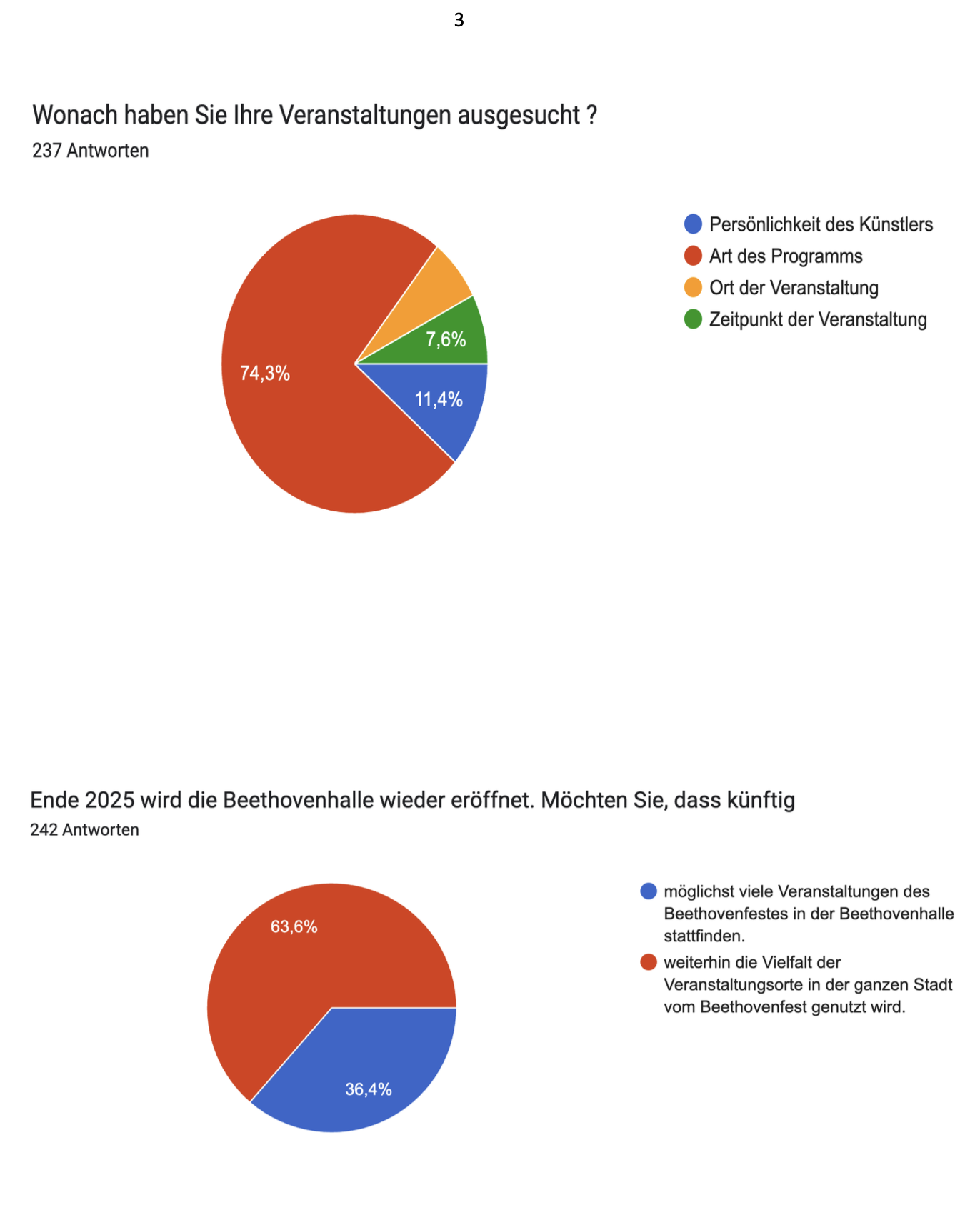 Nur ein Drittel der Befragten (36,4%) möchte, dass künftig „möglichst viele Veranstaltungen des Beethovenfestes in der Beethovenhalle stattfinden“. Zwei Drittel (36,4%) wollen, dass „weiterhin die Vielfalt der Veranstaltungsorte in der ganzen Stadt vom Beethovenfest genutzt wird.“