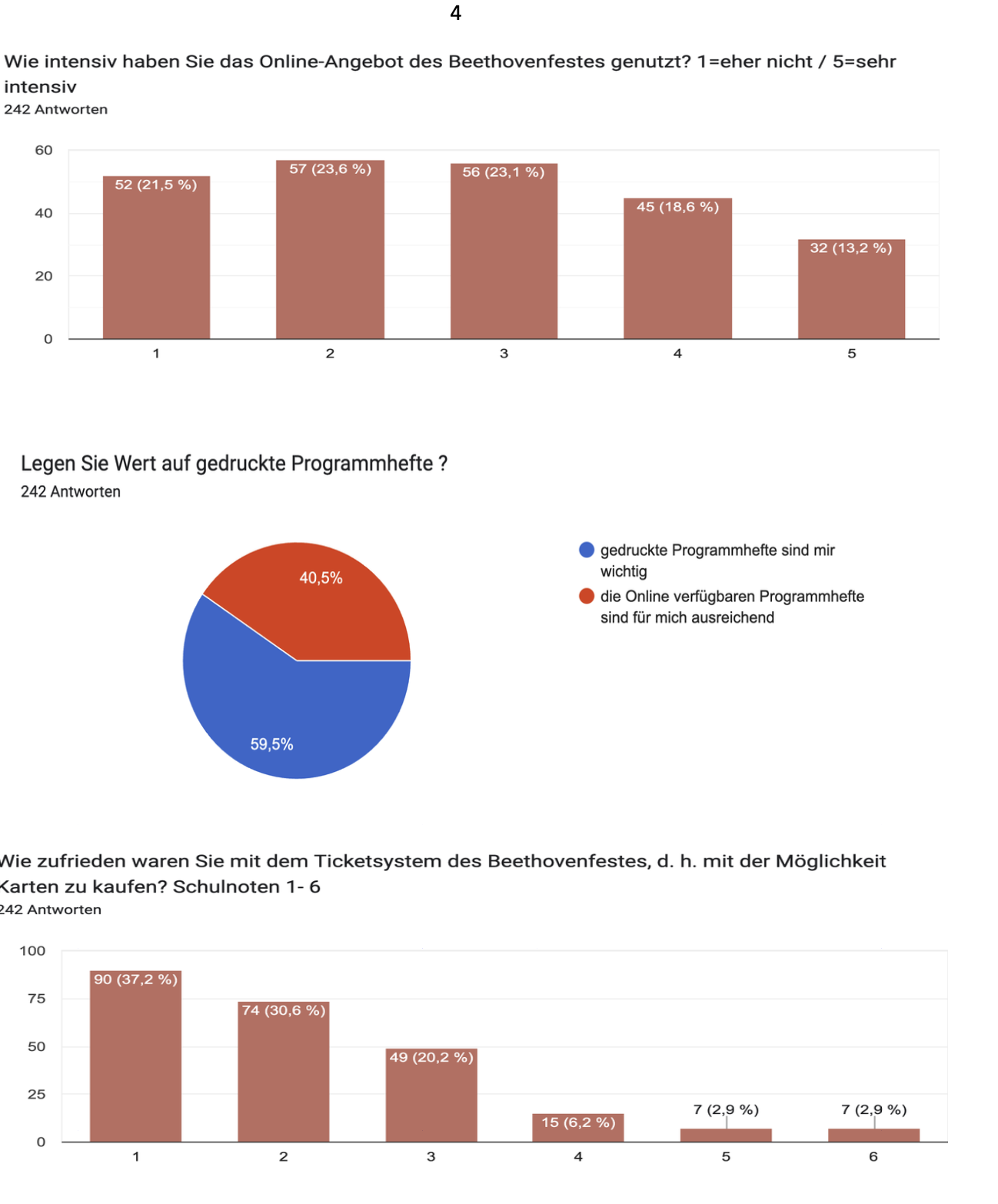 Im übrigen wurde häufig dafür plädiert, den Kartenkauf für das Beethovenfest an allen üblichen Vorverkaufsstellen und nicht nur über das Ticketsystem des Beethovenfestes zu ermöglichen. Besonders kritisch merkten viele Befragte an, dass ein Kartenkauf bei der städtischen Theater- und Konzertkasse nicht möglich sei. 60 Prozent der Befragten legen nach wie vor Wert auf ein gedrucktes Programmheft. Das Online-Angebot des Beethovenfestes wird von etwa 40 Prozent intensiver genutzt.