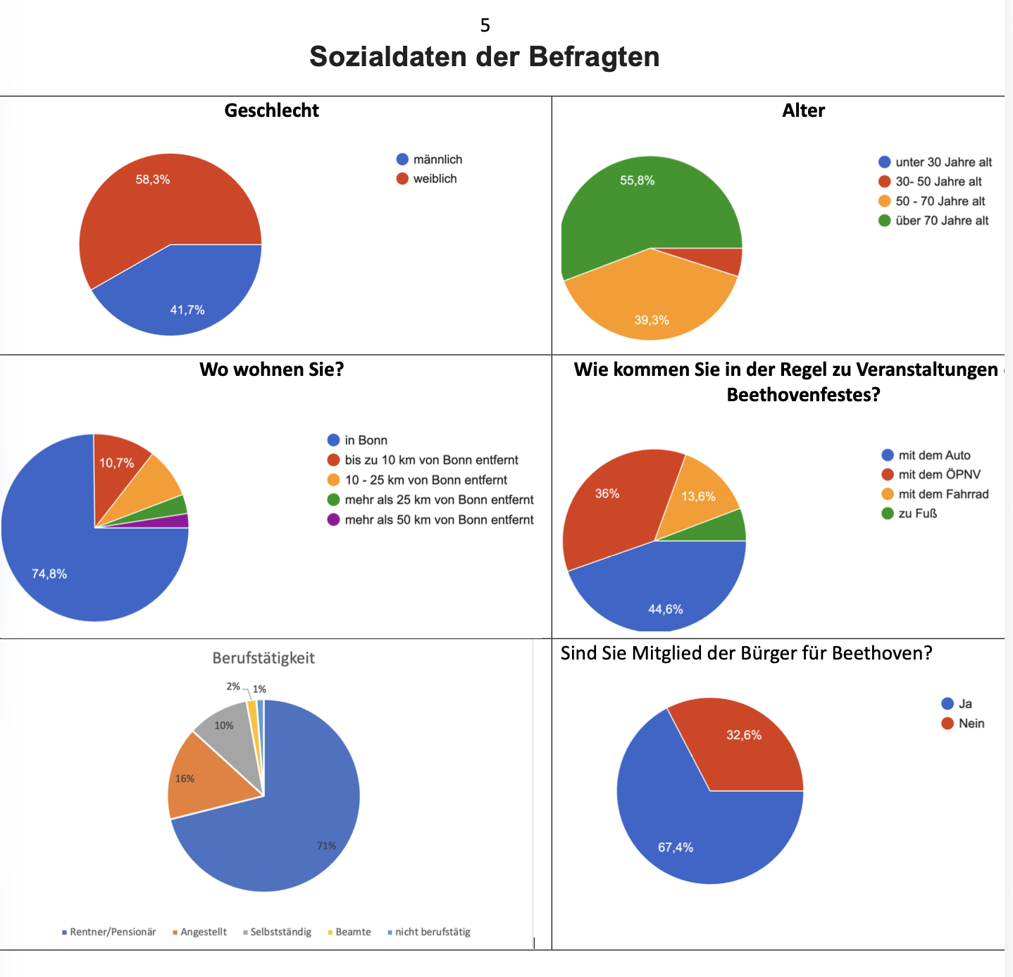 85 Prozent der befragten „Stammkunden“ wohnen in Bonn (74,8%) oder in einem 10-km-Radius um die Stadt (10,7%). Nur fünf Prozent haben eine Anreise von mehr als 25 km. Knapp die Hälfte der Besucher (44,6%) kommt mit dem Auto und ein weiteres Drittel (36 %) mit dem ÖPNV zu Veranstaltungen des Beethovenfestes. Eine Minderheit nutzen das Fahrrad (13,6%) oder kommt zu Fuß (5,8%). Knapp 40 Prozent der befragten Stammkunden sind 30-50 Jahre alt, etwas mehr als die Hälfte ist älter als 70 Jahre. Insgesamt sind 70 Prozent der Befragten nicht mehr berufstätig.