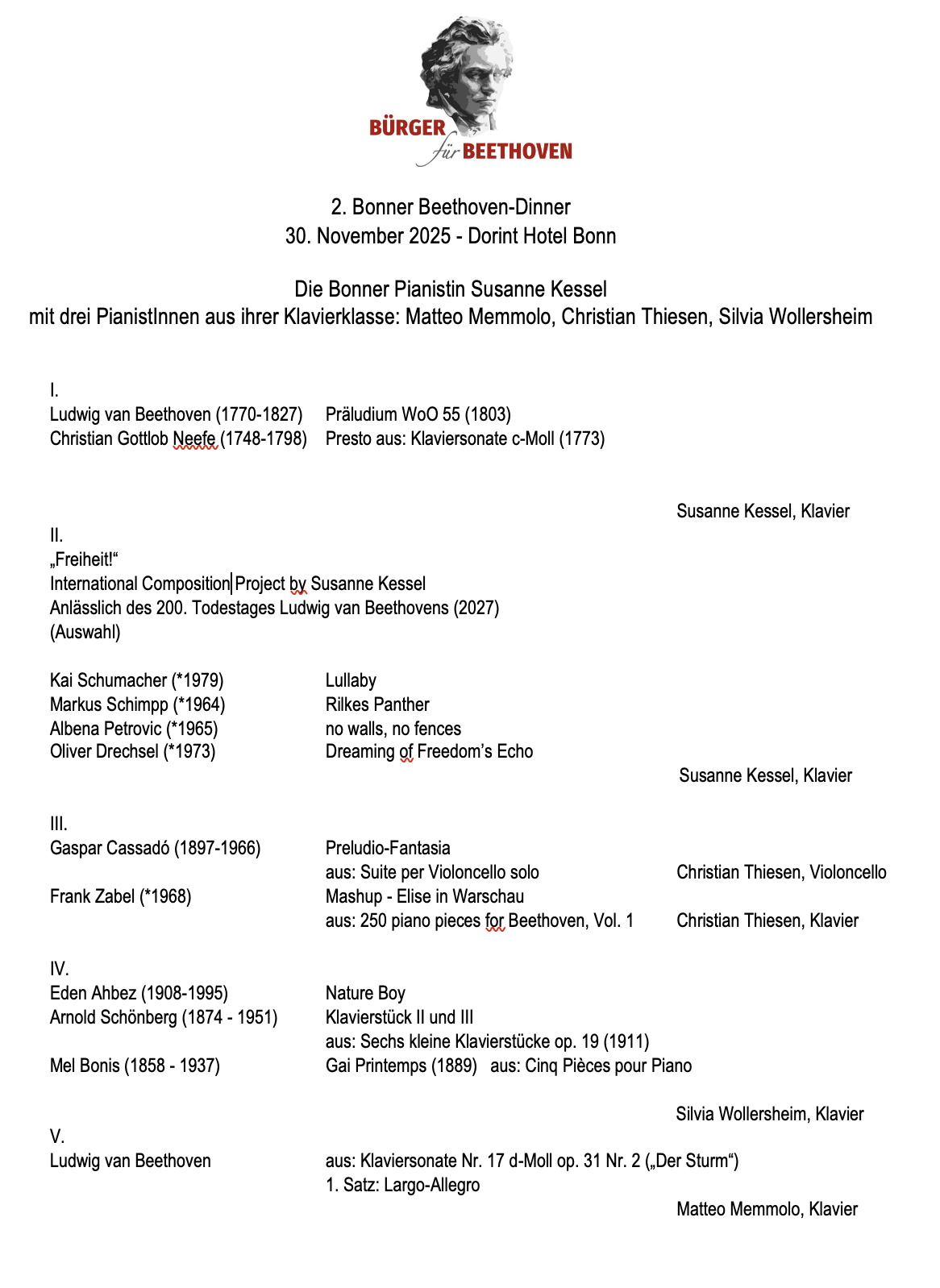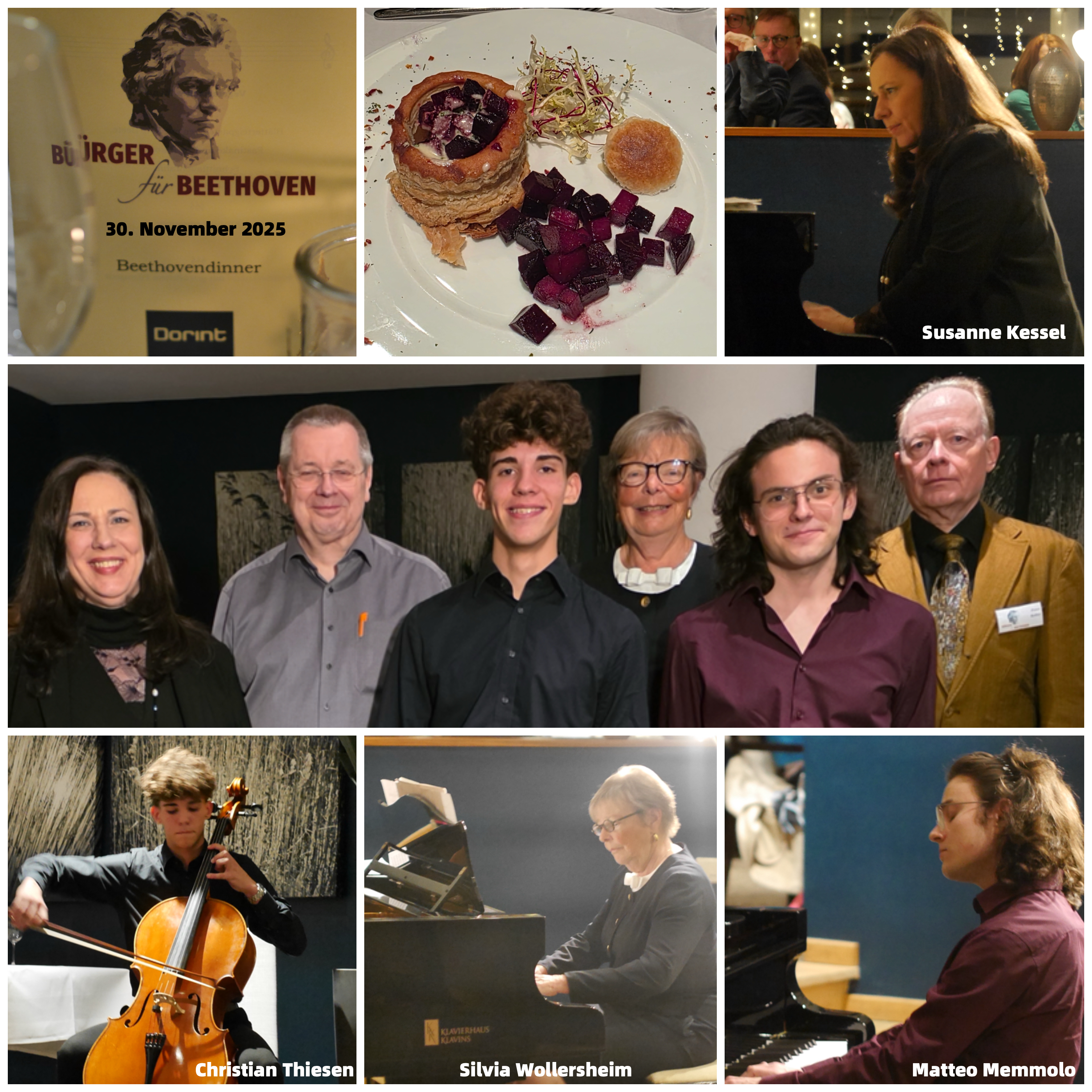 also am 30. Nevember erinnerten die BÜRGER FÜR BEETHOVEN im Bonner Dorint-Hotel an den großen Komponisten. Zu einem viergängigen Menü angelehnt an Speisekarten aus Beethovens Zeit kam ein musiklaisches Programm, das die Bonner Pianistin Susanne Kessel mit ihren Schülern gestaltet. Dazu steuert Stephan Eisel Informationen aus beethovens 22 Bonner Jahren bei.