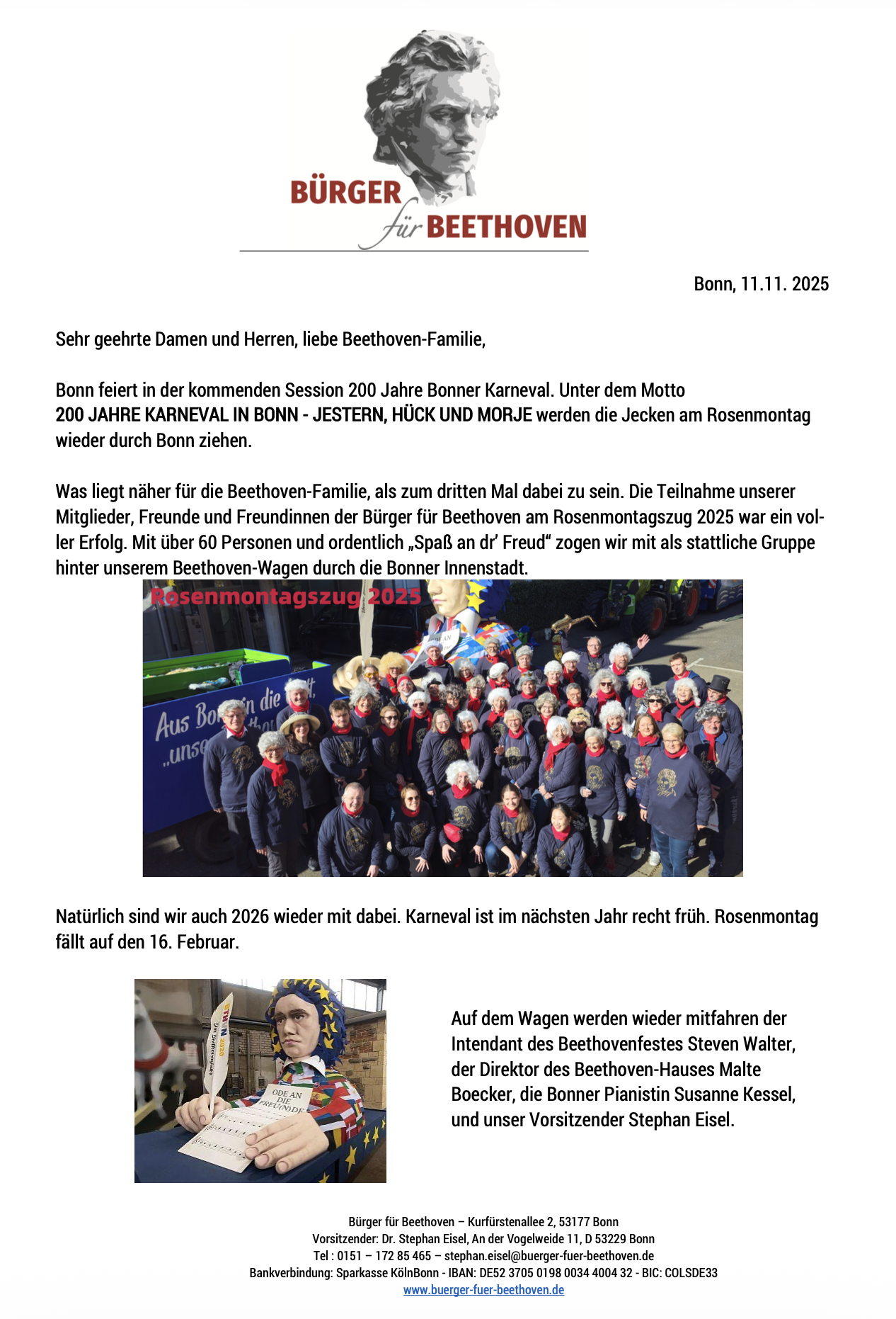 sind die BÜRGER FÜR BEETHOVEN in der Geburtsstadt des großen Komponisten natürlich wieder dabei - mit einem eigenen Beethoven-Wagen und einer Fußgruppe. Dabei kann jeder mitmachen. Das einheitliche Outfit stellt der Beethoven-Verein. Hier erfahren Sie dazu mehr und können sich anmelden.