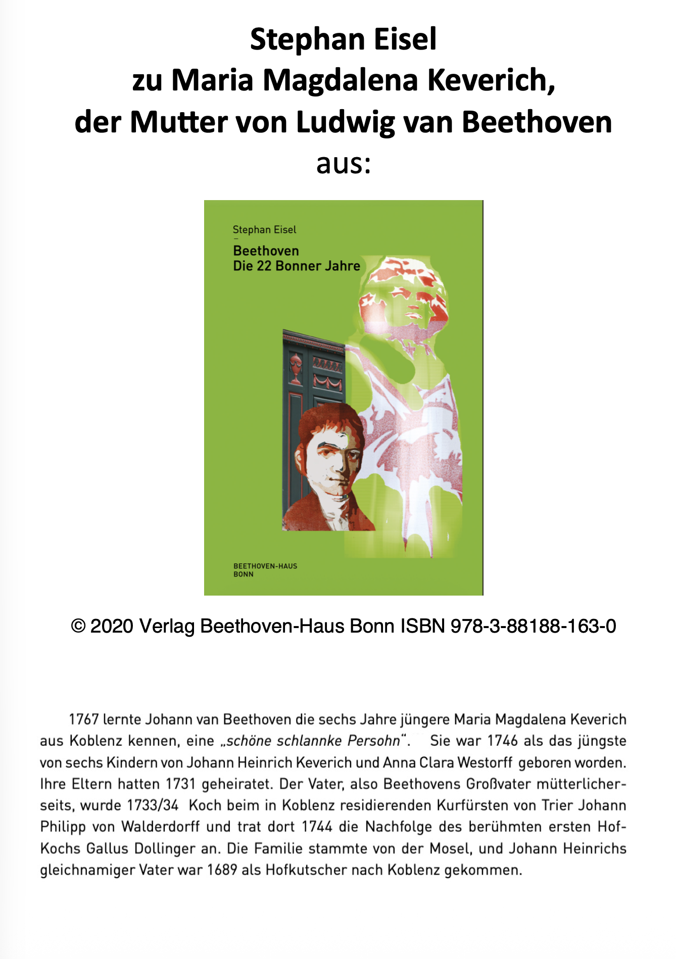 In Kooperation mit dem Verein „Förderer Mutter-Beethoven-Haus“ bieten wir einen Besuch des Geburtshauses, wie auch des Geburtsortes der Mutter Ludwig von Beethovens, Maria Magdalene Keverich, an.