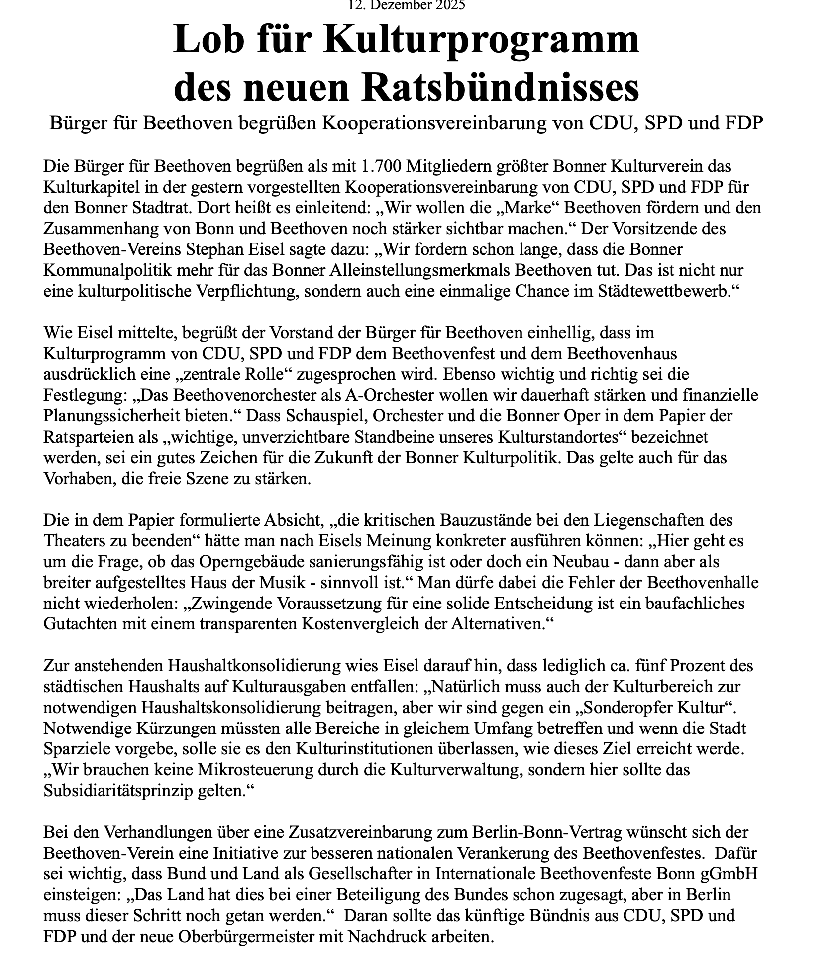 in ihrer Kooperationsvereinbarung für die Bonner Ratsperiode 2025 - 2030 vorgelegt haben, bei den Bürgern für Beethoven. Der Abschnitt beginnt mit der Aussage: „Wir wollen die „Marke“ Beethoven fördern und den Zusammenhang von Bonn und Beethoven noch stärker sichtbar machen.“ Dann werden Beethovenfest und dem Beethovenhaus ausdrücklich eine „zentrale Rolle“ zugesprochen und es heisst: „Das Beethovenorchester als A-Orchester wollen wir dauerhaft stärken und finanzielle Planungssicherheit bieten.“ Schauspiel, Orchester und die Bonner Oper in dem Papier werden als „wichtige, unverzichtbare Standbeine unseres Kulturstandortes“ bezeichnet. Außerdem soll die freie Szene gestärkt werden.