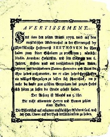 So kam es auch zum Konzert am 26. März 1778 im „musikalischen Akademiesaal in der Sternengaß„ zu Köln. Im Ankündigungszettel – der siebenjährige Beethovens wird darin ein Jahr jünger gemacht – war zu lesen, es werde „der Churköllnische Hoftenorist BEETHOVEN die Ehre haben zwey seiner Scholaren zu produciren; nämlich: Madlle. Averdonc Hofaltistin, und sein Söhngen von 6. Jahren.“