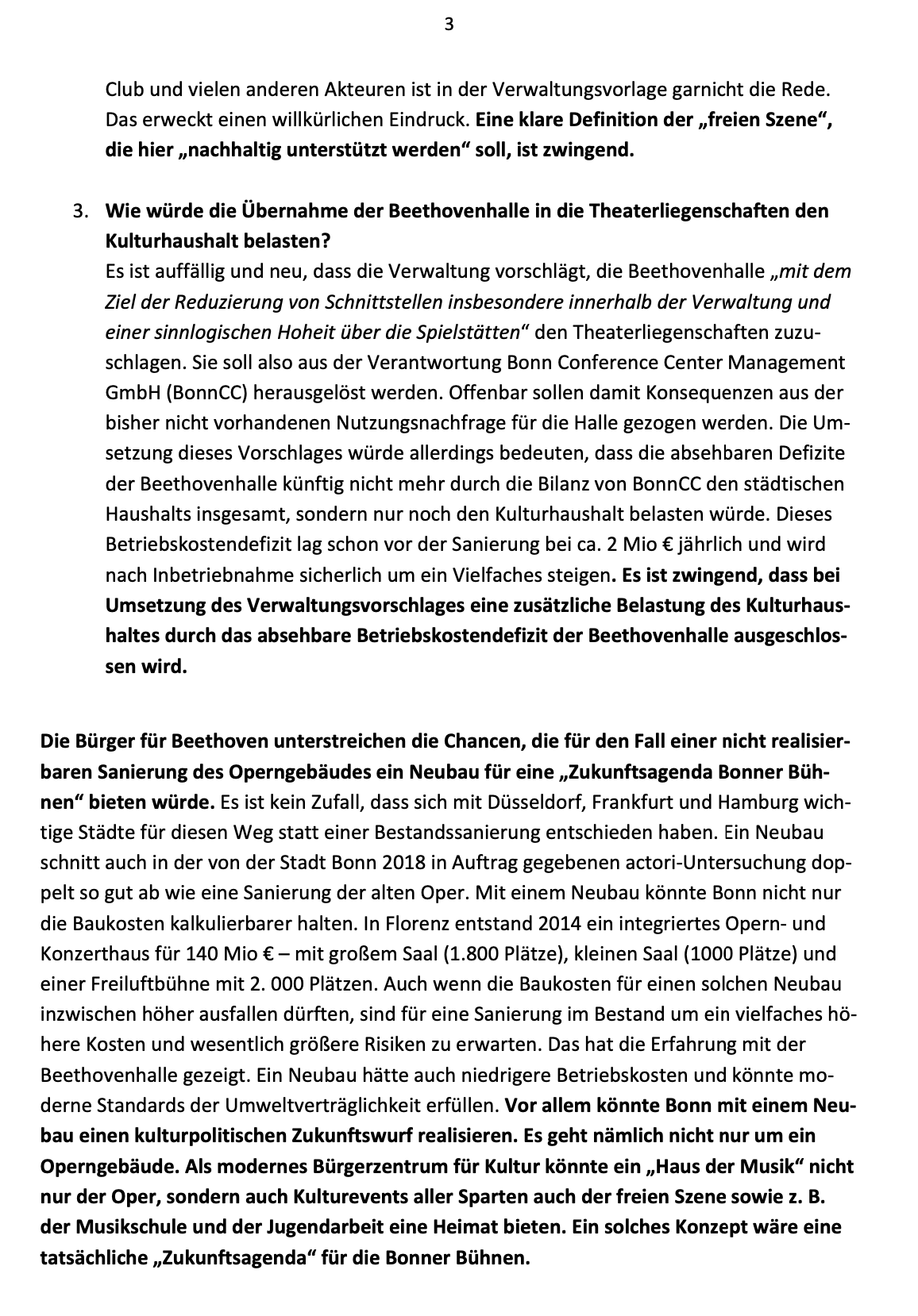 Ein grundlegender Mangel des Verwaltungskonzepts liegt nach Meinung der Bürger für Beethoven darin, bei einer „Zukunftsagenda Bonner Bühnen“ die bauliche Zukunft der Theaterliegenschaften, namentlich des Operngebäudes auszusparen. Das vom Rat Ende 2021 beschlossene Gutachten zur „Sanierungsfähigkeit“ des Gebäudes sei immer noch nicht in Auftrag gegeben. Für die Zukunft der Bonner Bühnen sei es aber entscheidend, ob man nach den desaströsen Erfahrungen bei der Beethovenhalle wieder eine Sanierung im Bestand riskieren wolle oder den Mut zu einem Neubau hat. Diese Lösung hätte nicht nur den Vorteil niedrigerer Betriebskosten und moderne Umweltstandards: „Vor allem könnte Bonn mit einem Neubau einen kulturpolitischen Zukunftswurf realisieren, nämlich ein modernes Bürgerzentrum für Kultur als Heimat nicht nur der Oper, sondern auch von Kulturevents aller Sparten, auch der freien Szene sowie z. B. der Musikschule und der Jugendarbeit.“